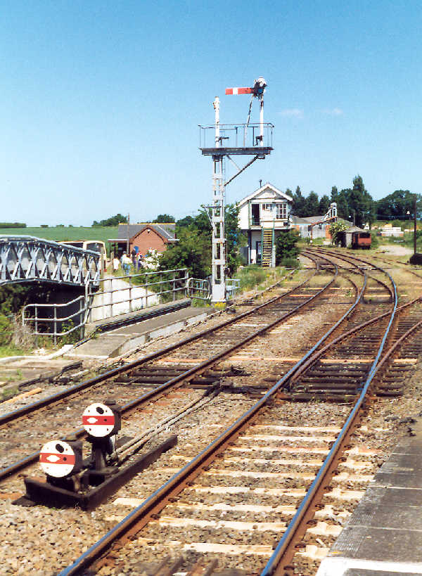 assurances from the BVR that its OK to cycle. We pause opposite the small signal cabin to observe and photograph the departure of the 10.15 boat train to Wroxham collecting the token from the signalman as it passes. We set of in pursuit easily keeping pace with the train until it picks up speed. It gave a lengthy blast on its whistle as it descended the 1 in 76 bank to pass through the steel and concrete tunnel under the A140 Aylsham bypass. The original standard gauge line crossed here by means of a level crossing, the East Norfolk Railway’s gate-keeper’s house still remains and is occupied. By the time we had negotiated the traffic on the bypass and the two wooden chicanes at the entry/exit point to the path the 10.15 was well on its way leaving a light trail of smoke as it disappeared into the distance, the early morning sun glistening on the locomotive and its carriages. The path has quite a reasonable surface considering it wasn't constructed for cycling on, though fenced off from the railway its part of the old track-bed and runs parallel along the North of the line as far as Little Hautbois Hall, at which point it crosses to the South of the line through to Wroxham. Before long we passed under the first of the many brick arch and girder bridges along the 9 mile stretch of line, 17 in all, (that's almost 2 to every mile). Next we came to Spratts Green level crossing where again the gate-keeper’s house still remains and is occupied. In the large garden of the property we observed an old Bauxite brown ex-railway goods van, these are often seen dotted around rural area’s, purchased by farmers and smallholders etc. as they became redundant from the railway, a useful ready made shed for storage or keeping livestock. As we continue, the prettiest part of the ride in my opinion can be seen to the north as we look across the valley and water meadows from the embankment to the small villages of Burgh next Aylsham and Brampton where cattle and horses were grazing the pasture. We were both so taken by the view that we paused here for a while to enjoy the peacefulness of our surroundings, Its at Brampton, just beyond the halt that we come across the first passing loop, here we were met a by a little diesel (the 10.15 to Aylsham) still adorned with its face from yesterday’s Thomas the Tank Engine event.We press on and soon arrive at Buxton. Buxton BVR is built on the site of Buxton Lamas station, like the intermediate stations at Brampton and Coltishall is basically just a halt, there are no buildings or waiting shelters just a low concrete pavement type platform for passengers to light onto and a station name board. The original Buxton Lamas station building remains as a private house. Shortly after leaving Buxton we came across the longest bridge on the line, the 105ft girder bridge which spans the river Bure just down stream from Buxton mill. Incidentally it was at this point we encountered the grumpy gentleman who mumbled ‘NO BIKES’. We replied with a polite ‘GOOD MORNING’. We paused on the bridge for sometime taking in the view and watching the trout in the crystal clear water, I don’t think I've ever seen so many trout all at once. We took a couple of photo’s before moving on. After a few hundred yards we reach the halfway point ‘Hautbois loop’ the principal passing place for the trains, just beyond the loop the path changes to the south of the line via a level crossing at Hautbois Hall. As we cycled on toward our next stop we could clearly see RAF Coltishall on our left, the Railway is only a few hundred yards from the end of the runway, directly under the flight path of aircraft taking off and landing, hence the curve at this point is named ‘Runway curve’, although there was no activity at the base today I would imagine this would be a fine vantage point for aircraft spotter’s (sorry enthusiasts). Two of the loco’s at the BVR have Commemorative names linked to the history of RAF Coltishall, 2-6-2 ZB No.7 Spitfire, and Bo-Bo No.3 2nd Air Division USAAF. The base is home to 6, 41 and 54 Squadrons all equipped with Jaguar fighters. After about a mile we arrive at Coltishall station, basically the description is identical to that of Buxton, Coltishall differs in as much as it has a passing loop and an Island platform, nothing of the original East Norfolk Railway remains today except the station building which is now a private house. As we leave Coltishall for Wroxham now only 2½ miles away we pass under four bridges in very quick succession before arriving at our 3rd level crossing ‘Belaugh Green’, as with all other gate keeper’s houses along the line it is privately occupied and well maintained. We cross the road, again negotiating the wooden chicanes which are almost as numerous as the bridges along the route. After a couple of hundred yards we could see ( to the north ) the Norwich - Cromer line, so we knew Wroxham wasn't far now, we were both looking forward to our picnic lunch. As we approached Wroxham, the BVR runs into a cutting as it curves to the right before running into the Wroxham BVR station parallel with the ‘Anglian Railway’s’ line from Norwich to Cromer and Sheringham. The path continues along the top of the cutting before descending sharply to track level at journey’s end. The time was now 12.15 and our thoughts now were focused on food. Disappointingly there were no picnic tables or anywhere to sit and have our lunch at the BVR so we decided to cycle the short distance into Wroxham and hopefully find a somewhere nice to sit by the river ...‘ Great Idea’ we thought... ‘Big Mistake’, it was packed, people everywhere. So with nowhere to rest our legs we returned and eat our lunch on Wroxham ‘Anglian Railway’s’ station, at least there were some seats to sit on, even if they were in the shade, we perched our backsides on the edge of a large flower container soaking up the sun while we dined, it was possibly the quie